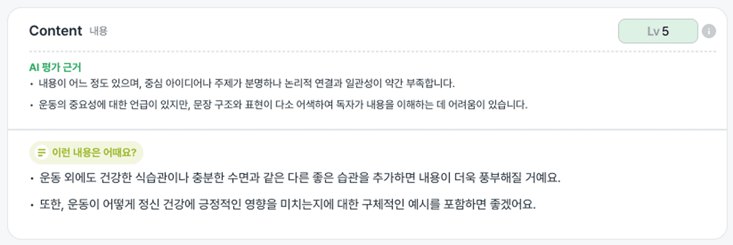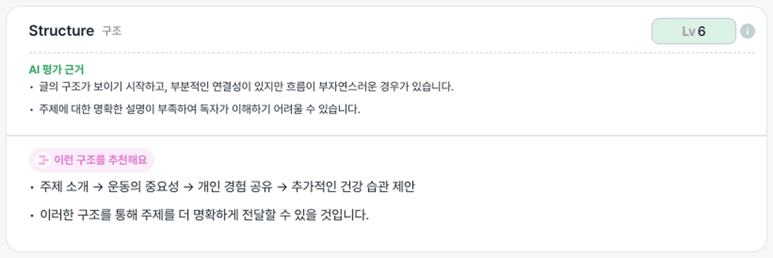 '건강한 습관'을 주제로 스피치한 내용에 대해 AI가 준 피드백입니다.