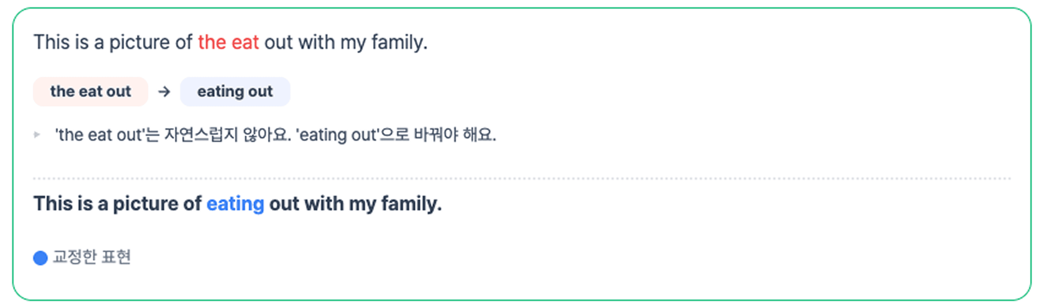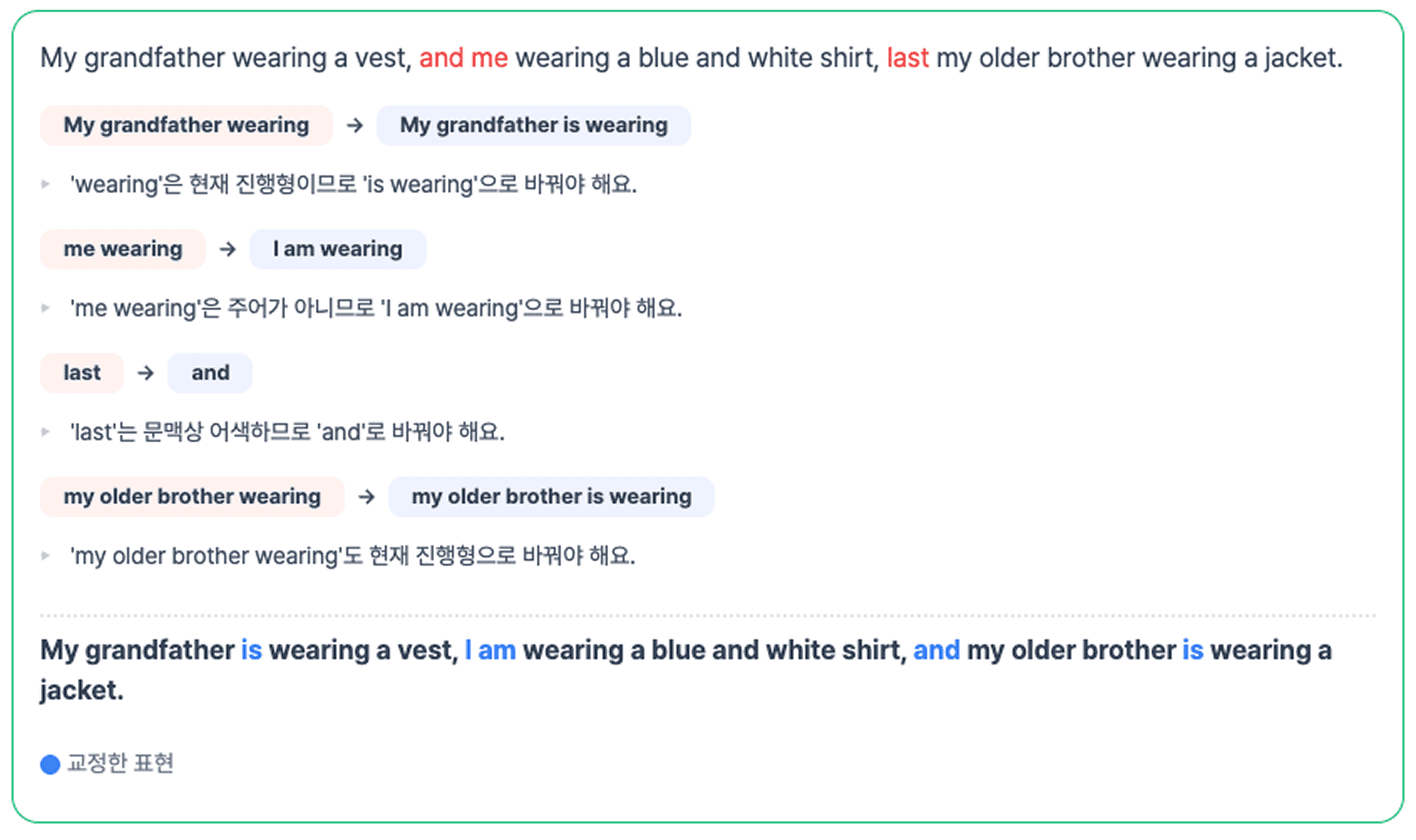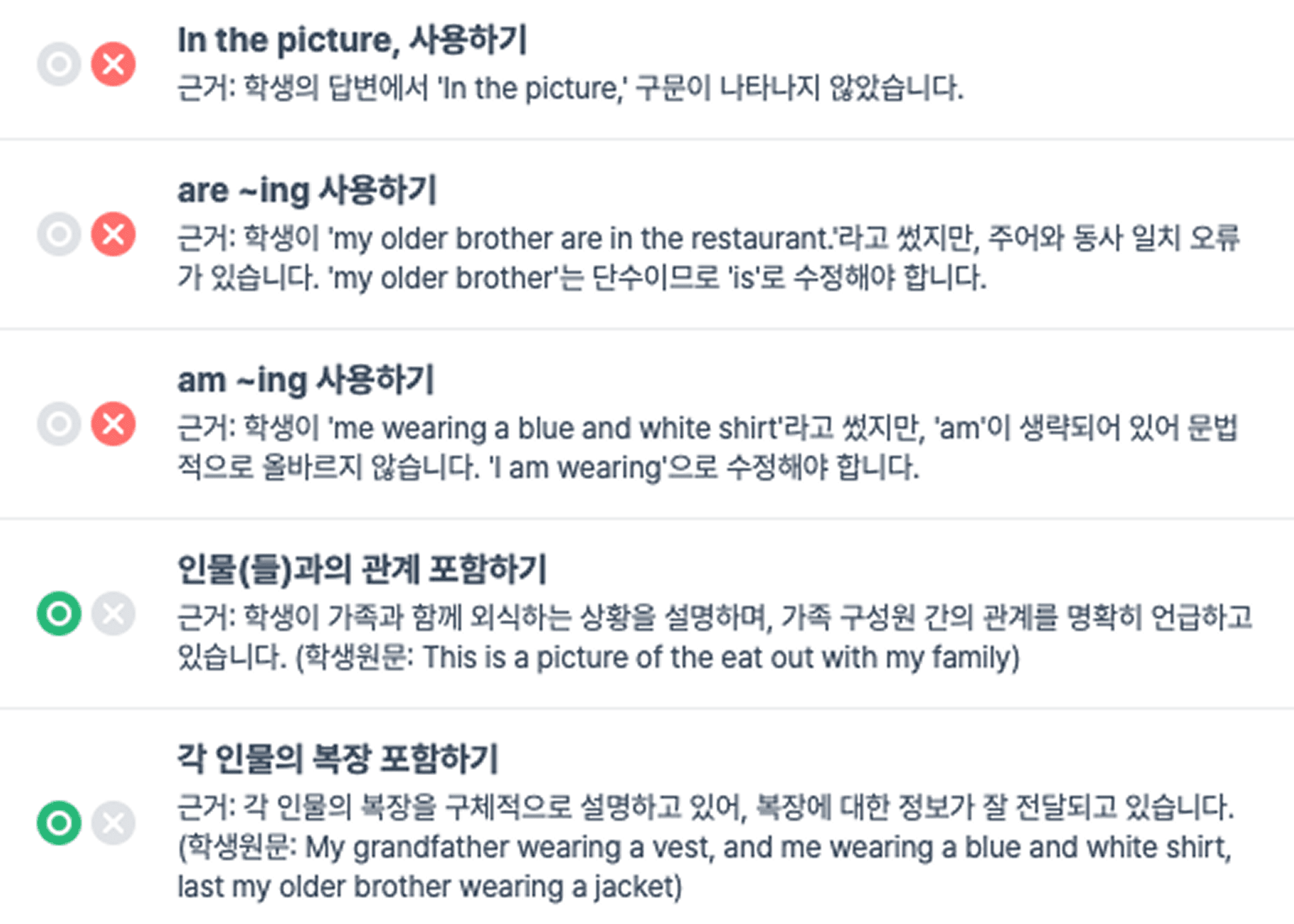 (아래 이미지는 학생 개인정보 보호를 위해, 실제 학생이 제출한 글과 피드백을 재현한 사례입니다. )