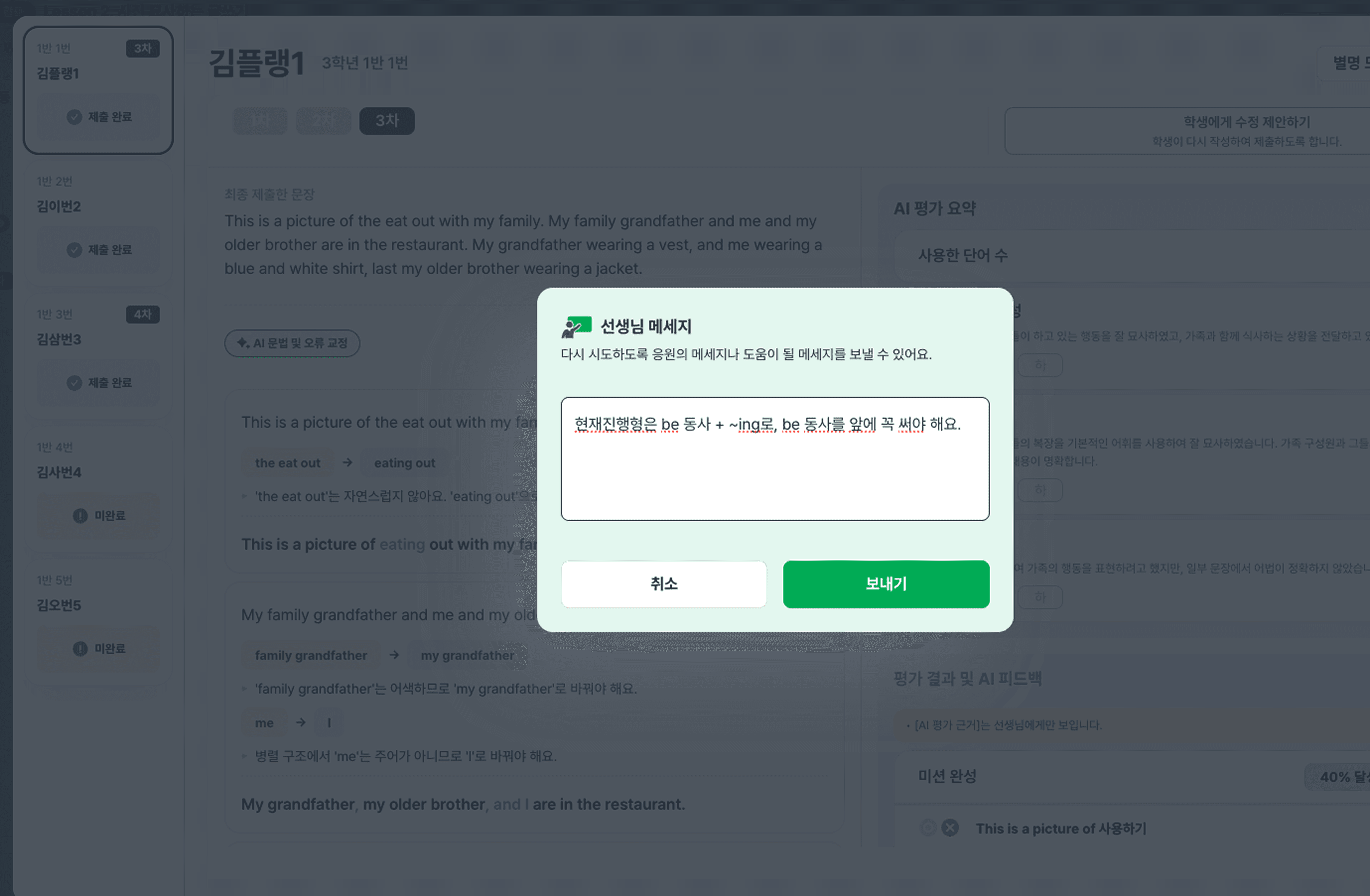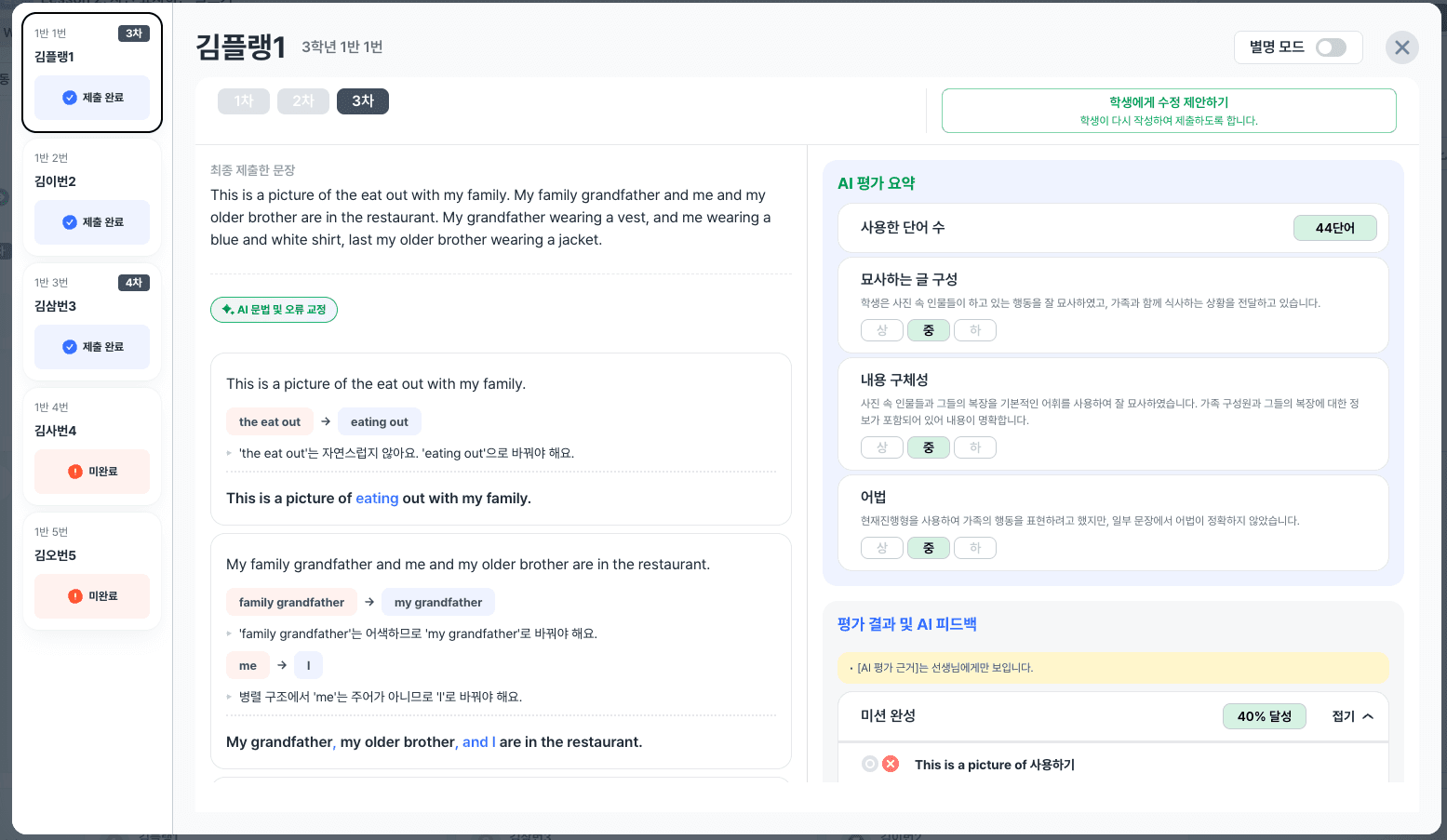 초안 작성이 끝나면, 교사가 사전에 입력한 채점 기준을 바탕으로 플랭AI가 피드백을 제공합니다. 학생들은 문법 오류, 표현의 부적절성, 내용의 구체성 부족 등에 대한 자동 피드백을 확인하고 글을 수정·보완합니다. 이 과정에서 단순히 정답을 고치는 것이 아니라, 왜 수정이 필요한지 스스로 판단하며 글을 발전시키는 경험을 하게 됩니다.
