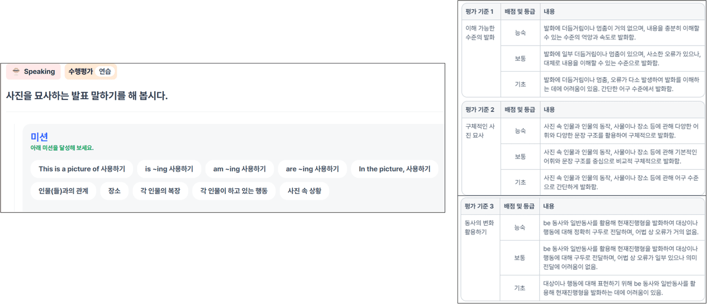 특히 채점기준의 설계는 매우 중요합니다. 교사가 어떤 요소를 평가 기준으로 설정하느냐에 따라 학생들의 말하기 방향 자체가 달라지기 때문입니다. 과업의 목적에 부합하는 기준을 명확하게 설계하고 이를 AI 시스템에 반영해야 합니다. 평가 기준이 명확할수록 AI 피드백 또한 훨씬 유의미하게 작동합니다.