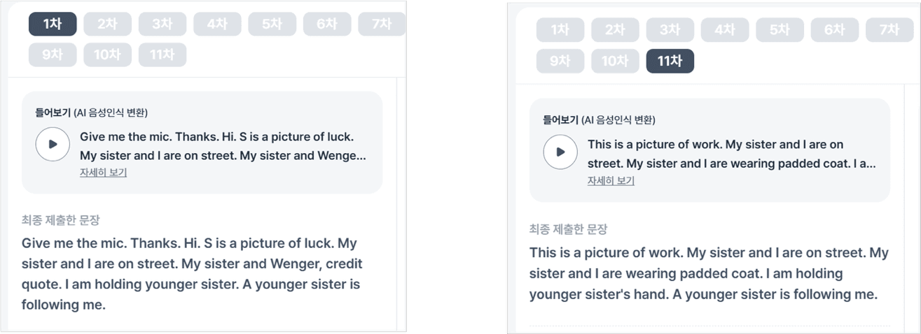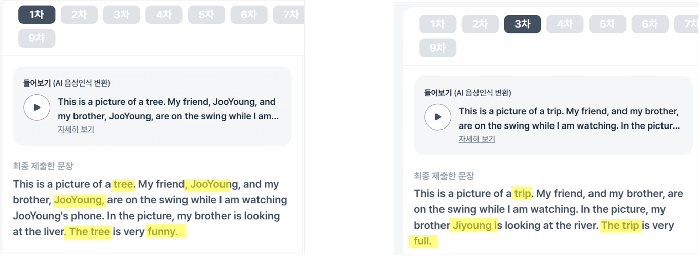 이 과정은 일회성으로 끝나지 않습니다. 2차시 내내 반복 연습 중심으로 운영되며, 학생들은 AI 피드백을 반영해 다시 녹음하고 수정하는 과정을 여러 차례 반복합니다. 충분한 반복 기회를 통해 말하기에 대한 자신감을 쌓고, 점진적으로 표현의 정확성과 유창성이 향상될 수 있도록 합니다.