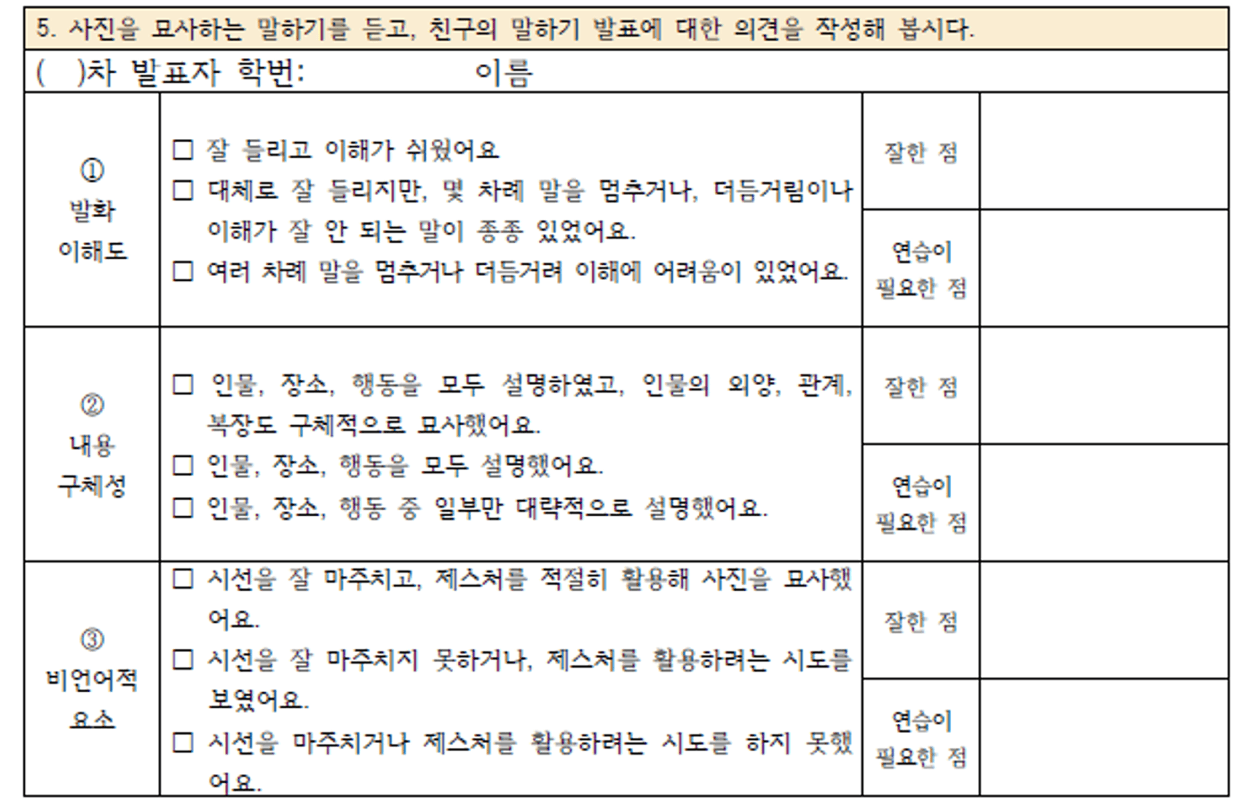 발표가 진행되는 동안 다른 학생들은 3차시와 동일한 방식으로 동료평가를 실시하며 친구의 발표를 경청합니다. 동료평가 인원 수는 과도하게 설정하지 않아 평가 자체가 지나친 부담이 되지 않도록 조절합니다. 교사 또한 평가 기준에 따라 말하기 수행을 함께 평가합니다.