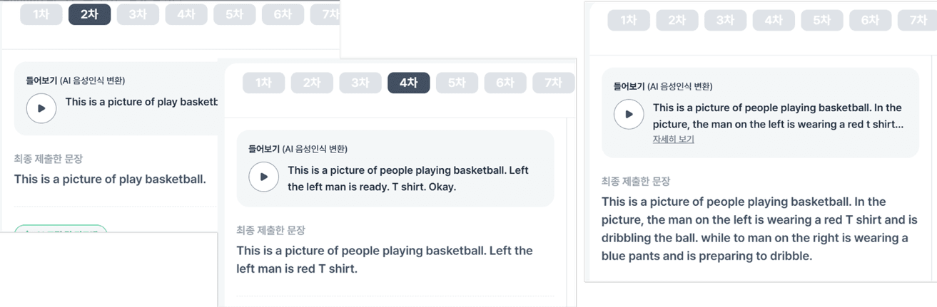 여러 차례 말하기 기회를 제공하면서 학생들의 발화 내용도 점진적으로 확장되었습니다. 처음에는 사진에 대한 단순한 설명에 그쳤던 것이, 반복 연습을 거치면서 배경 설명, 인물의 복장이나 동작에 대한 묘사, 자신의 느낌이나 상황 맥락까지 포함하는 방식으로 내용이 양적으로 늘어났습니다. 충분한 연습 기회가 주어질 때 학생들은 자신이 실제로 전달하고 싶었던 내용을 훨씬 적극적으로 표현하게 됩니다.