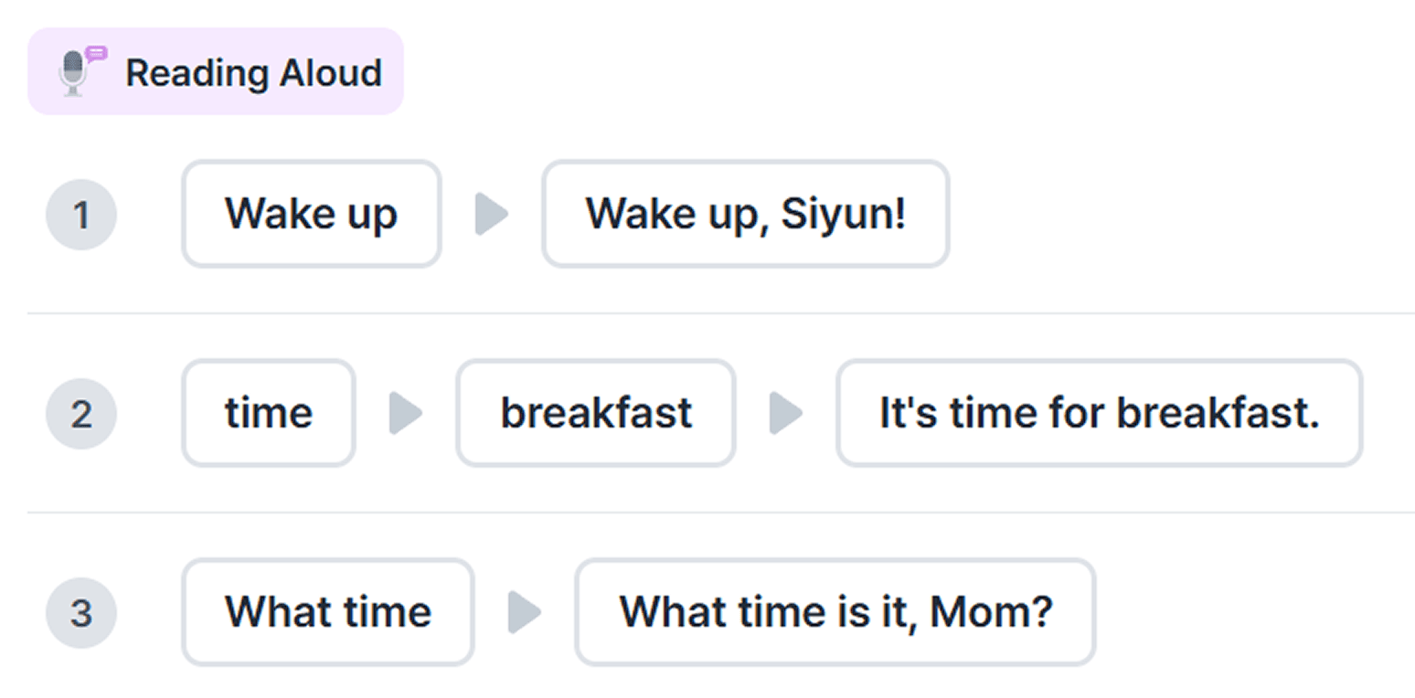 가끔 물음표(?), 의문사, 관사 등이 자동으로 빠지는 경우가 있는데, 이 경우에도 **What**과 같이 강조하고 싶은 부분에 별표를 붙여주면 오류 없이, 선생님이 의도한 대로 Reading Aloud 활동을 생성할 수 있습니다.