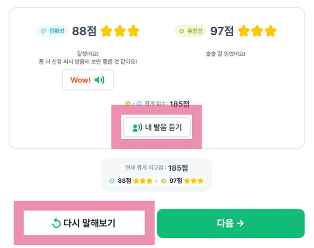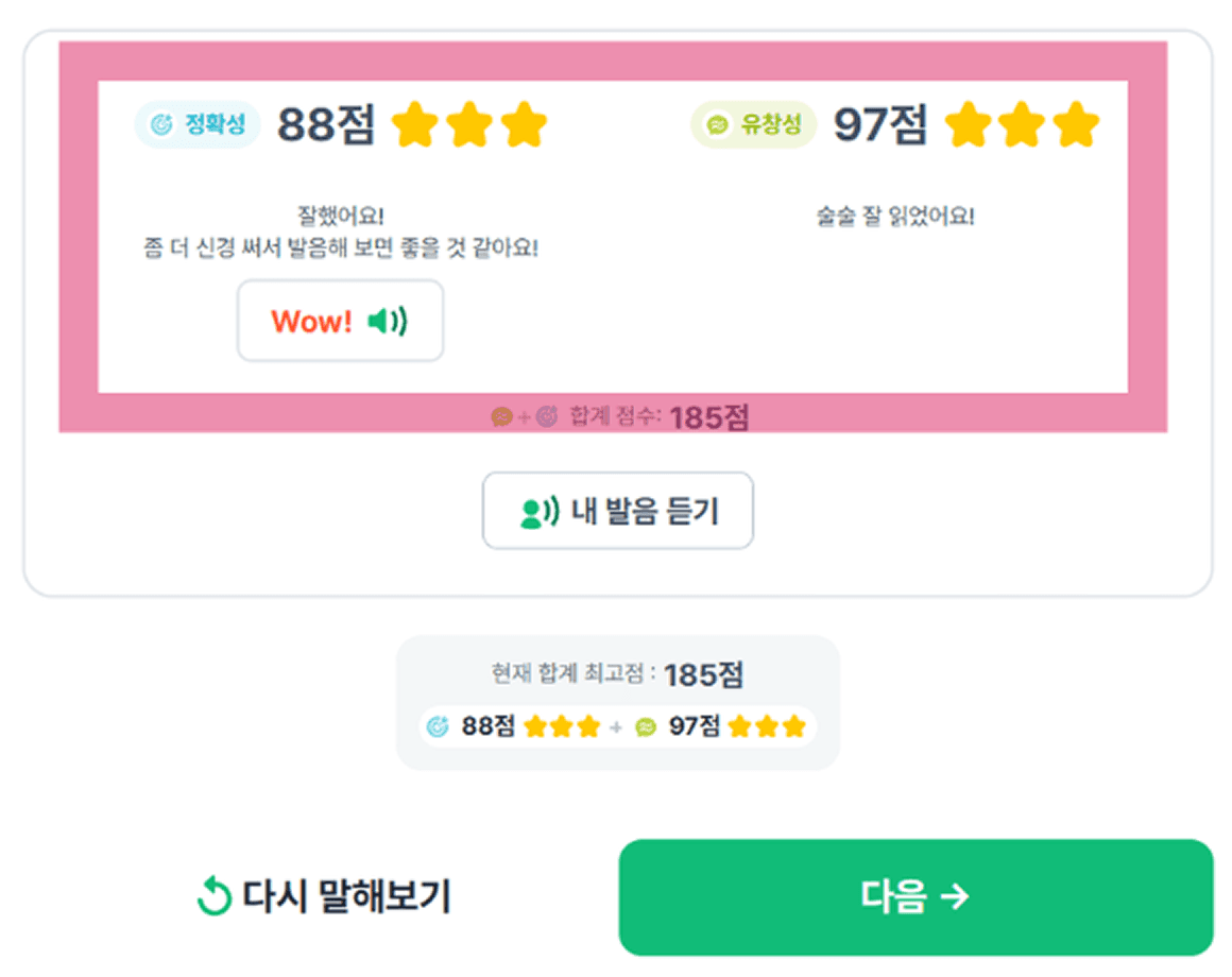 학생들이 자신의 발화를 단어 → 문장 순으로 반복적으로 듣고 연습하며 점수를 올리는 과정에서 성취감을 느낍니다.