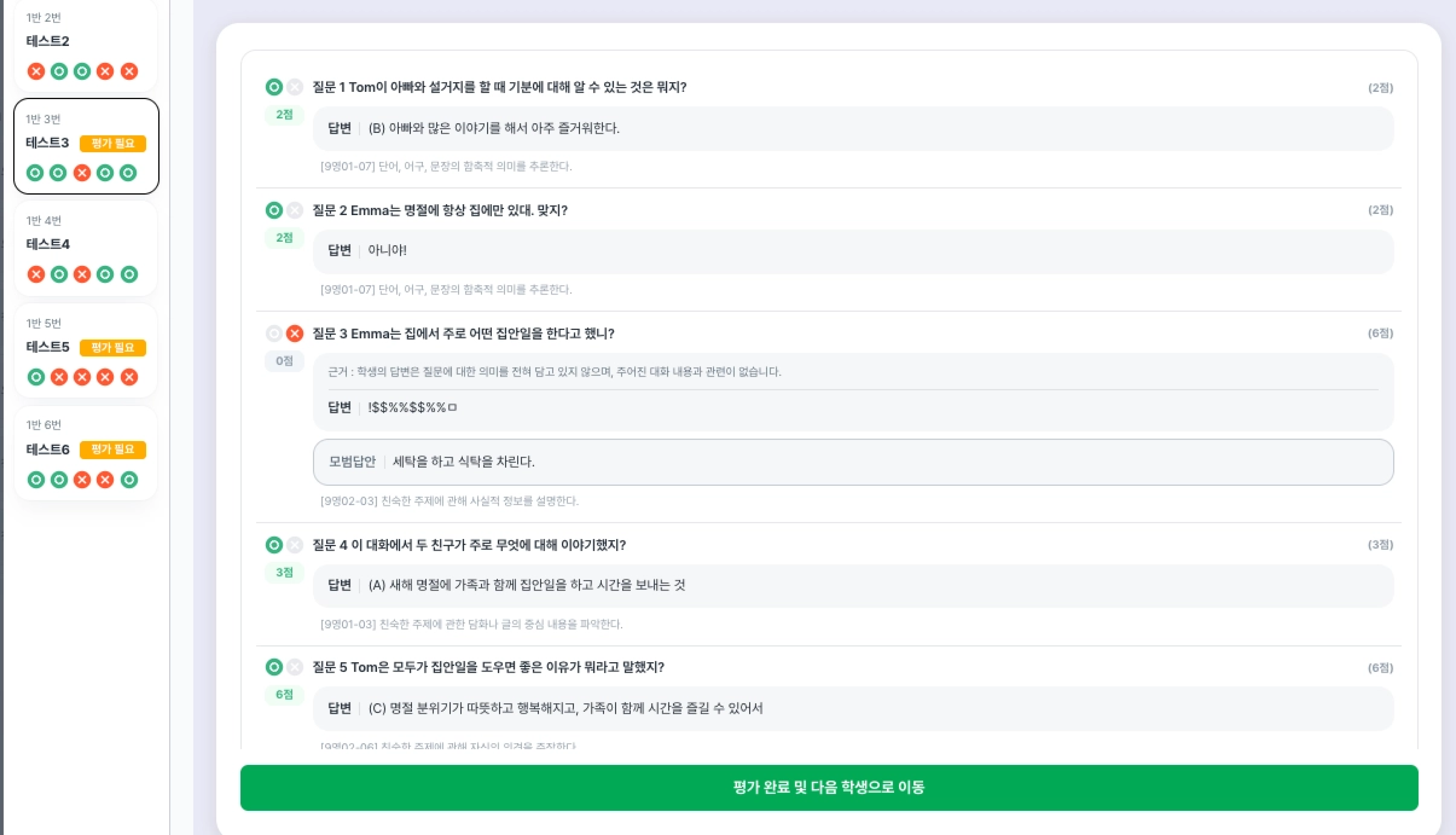 평가 완료 후, 선생님은 학생의 성취기준별 점수를 확인하고 수정할 수 있습니다.