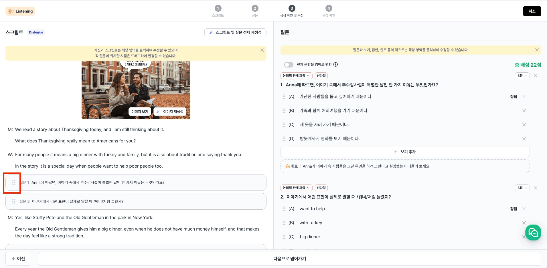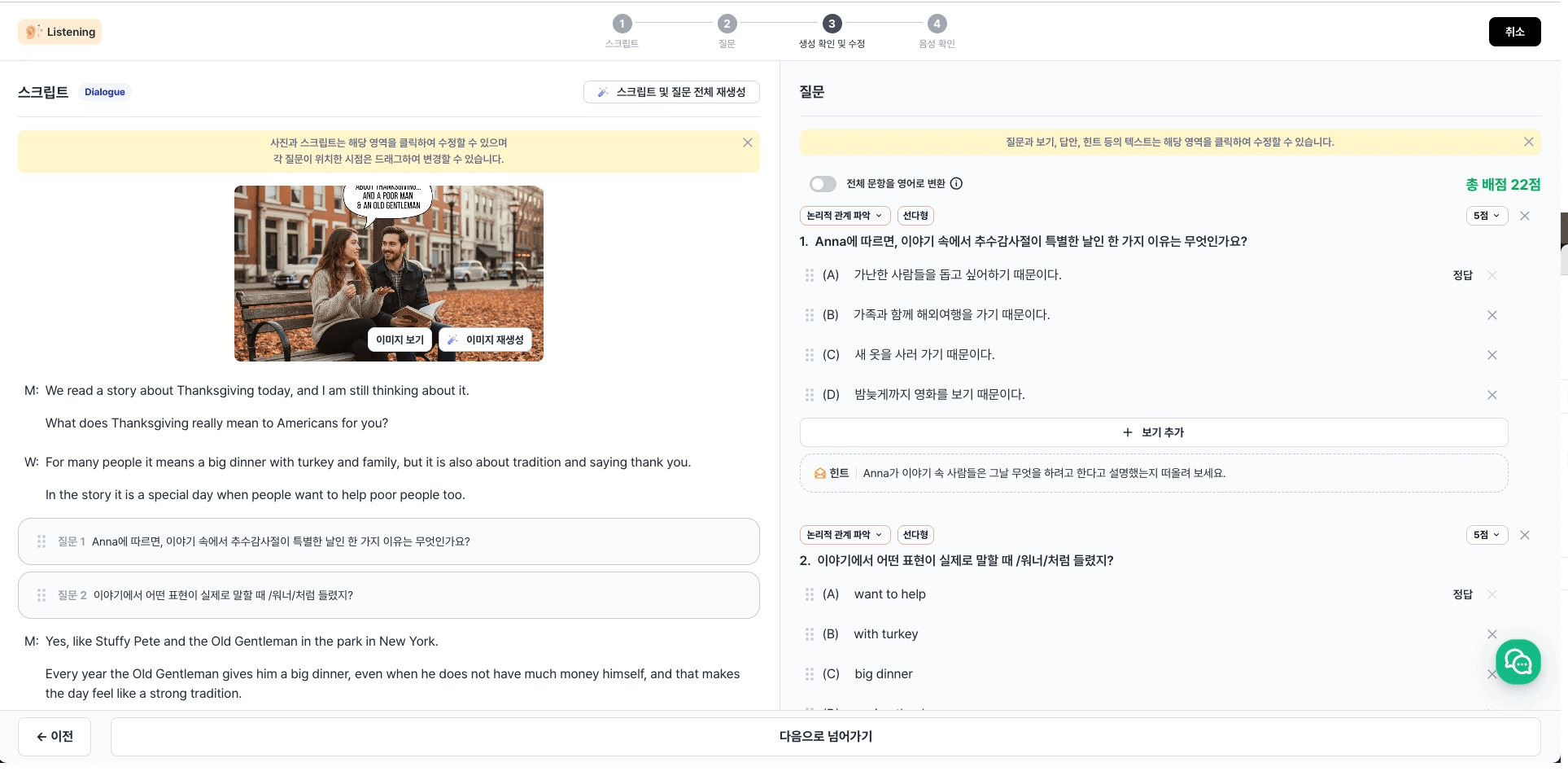 AI가 선생님의 의도와 성취기준을 기반으로 스크립트와 음성 파일, 질문을 생성합니다.
