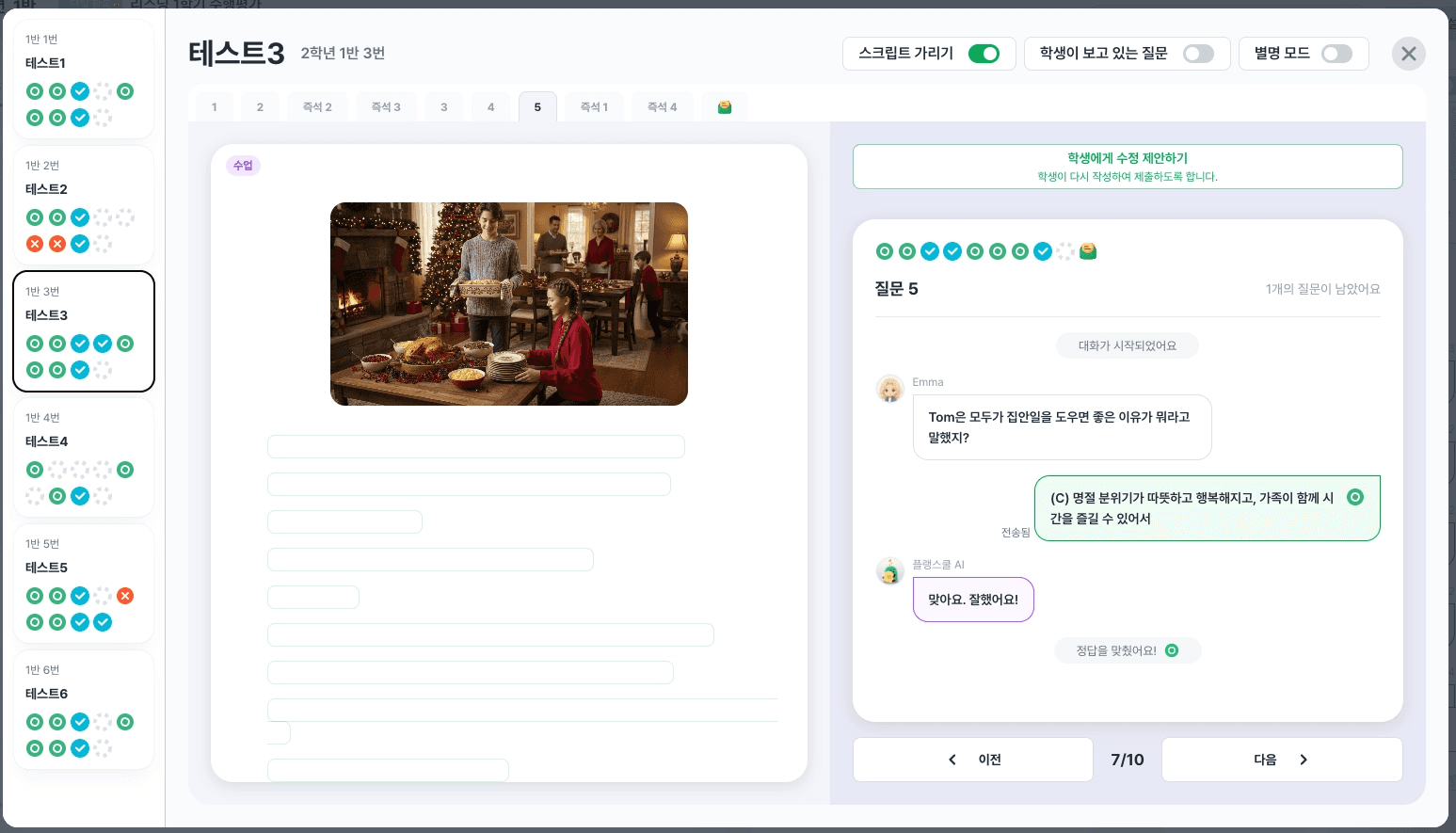 플랭스쿨 리스닝은 질문이 스크립트 중간중간에 배치됩니다. 어떤 내용을 들었는지, 지금 무슨 상황인지 흐름 안에서 확인하며 나아가는 구조입니다. 덕분에 지문이 길어져도 난이도가 급격히 올라가지 않습니다. 질문이 중간에 이해를 잡아주기 때문입니다. (물론, 선생님이 질문의 위치를 변경하실 수 있습니다.)