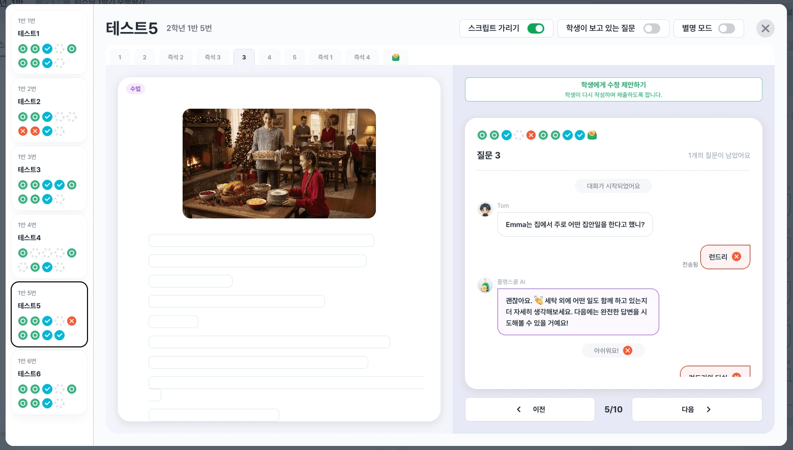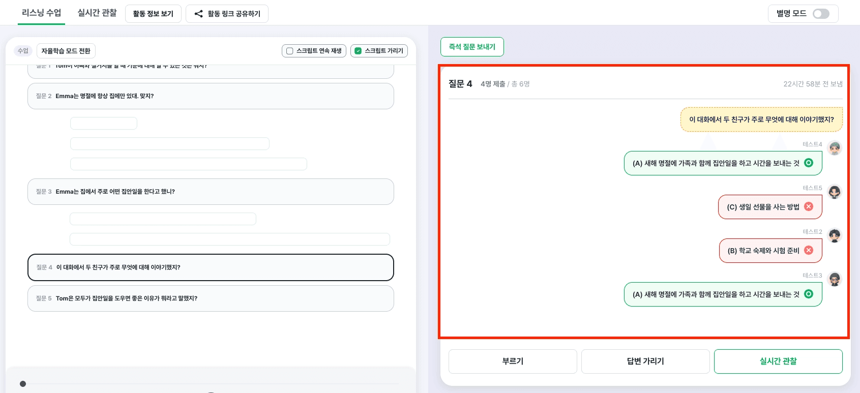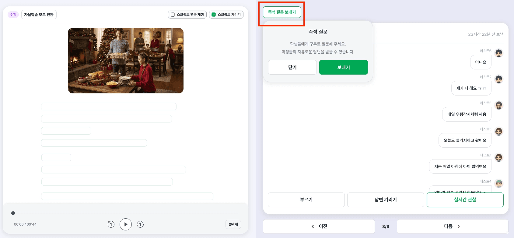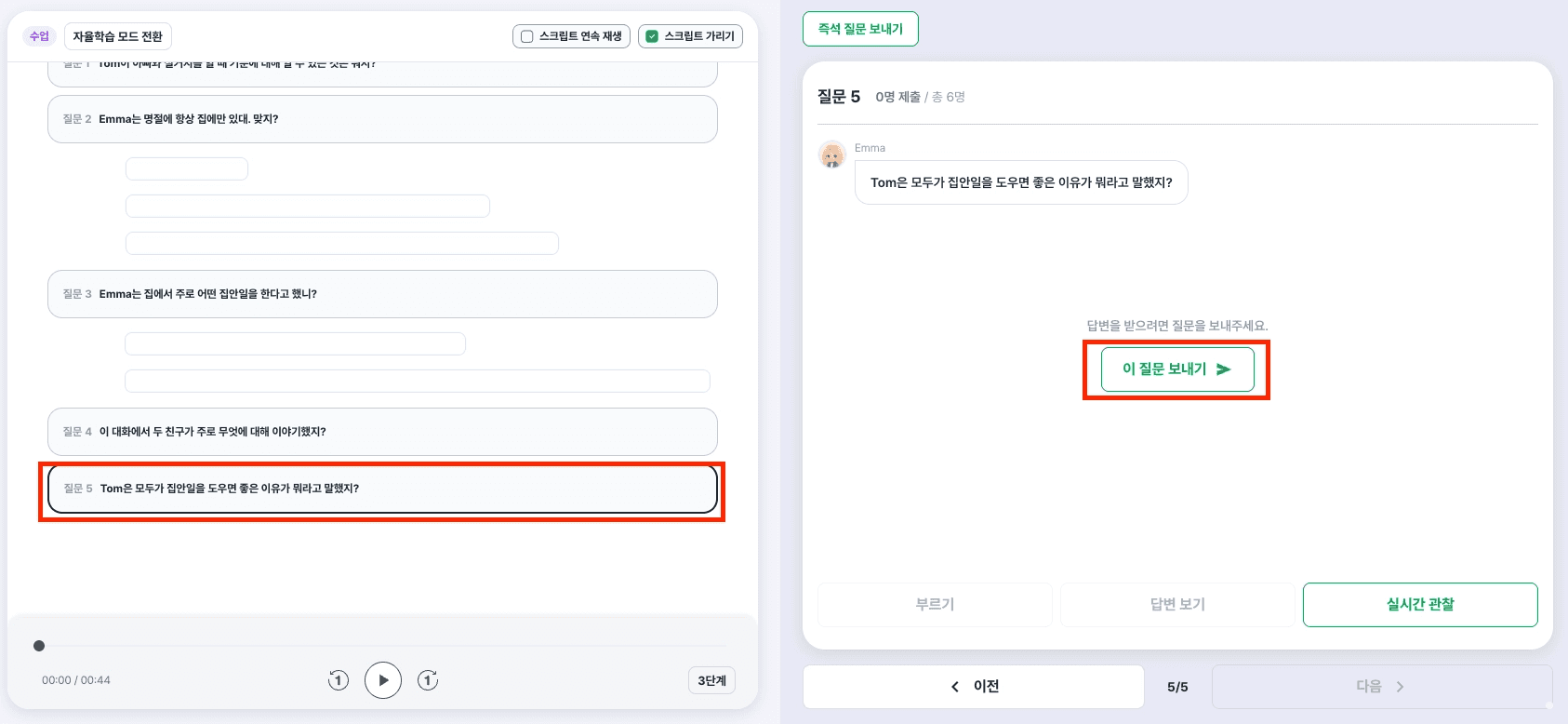수업 모드에서는 스크립트 재생 권한이 선생님에게만 있습니다. 선생님이 음성을 틀고, 준비가 됐을 때 질문을 하나씩 학생에게 보냅니다.