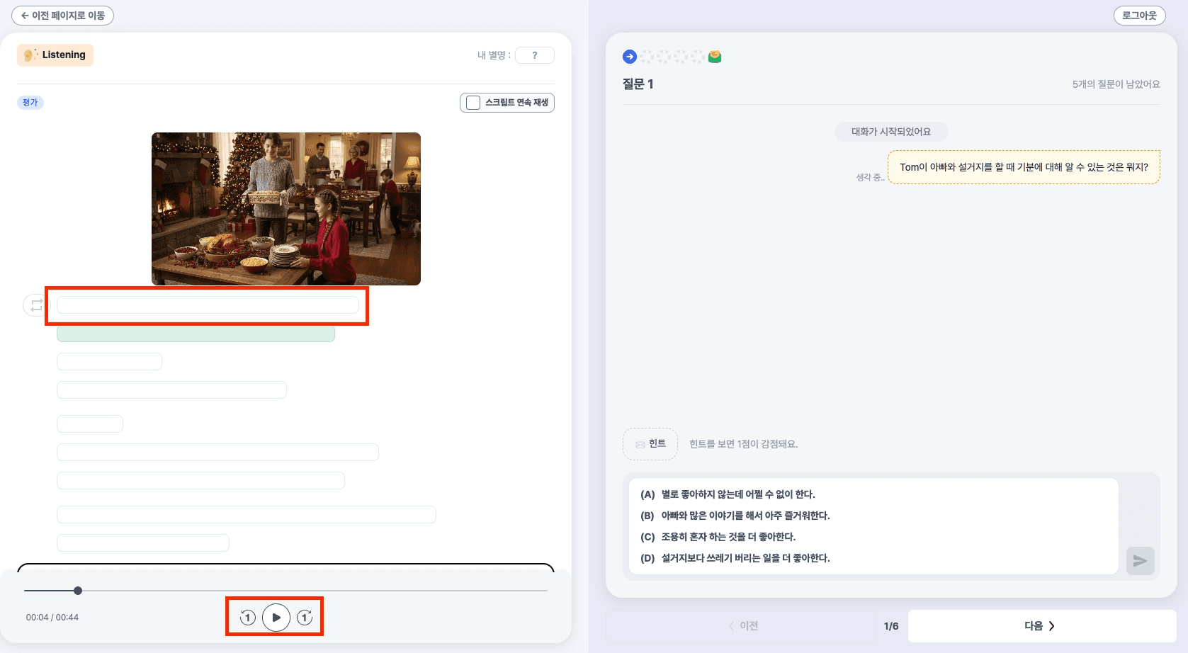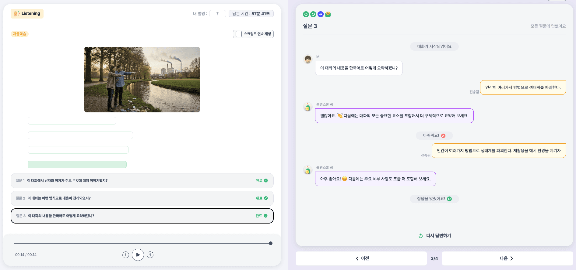 자율학습 모드에서는 학생이 음성을 자유롭게 재생하고 반복 청취하며, 질문에 답변하면 AI 피드백이 바로 돌아옵니다.